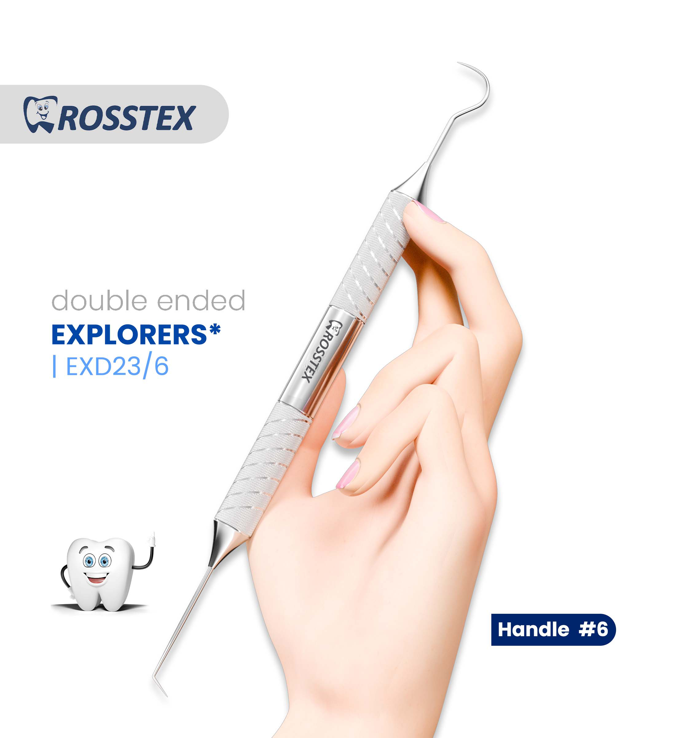 Explorer EXD23/6 combines a #23 Shepherd’s Hook end for detecting caries with a #6 end suited for general examination. This double-ended tool features a comfortable, ergonomic handle in stainless steel, offering high durability and precise tactile sensitivity for thorough diagnostic assessments​.