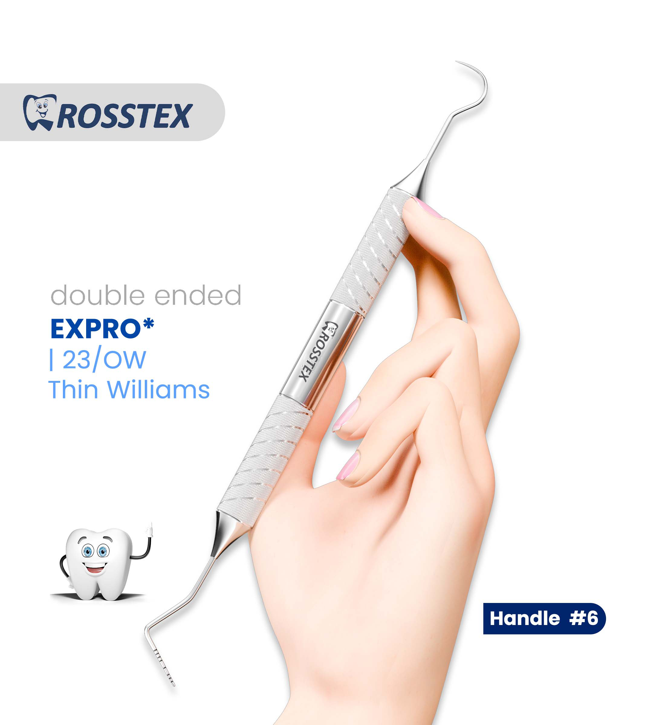 Expro XP23/OW is a double-ended dental instrument with a Williams-style probe on one end and an explorer on the other. It features a Thin Williams marking system for precise periodontal assessment, commonly used in dental exams and charting.