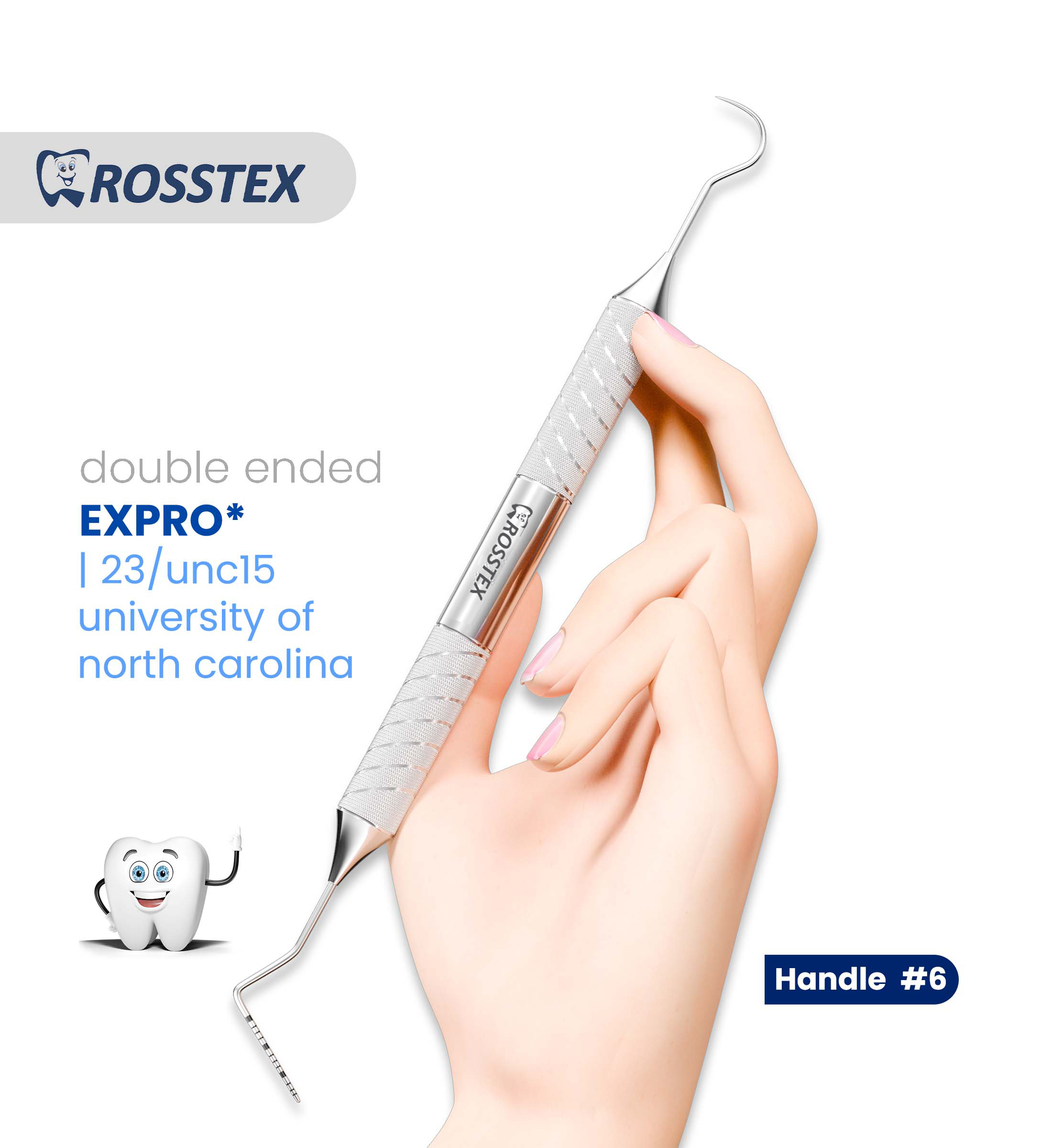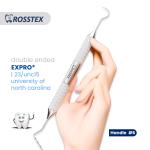 Expro XP23/UNC15 is a double-ended dental instrument combining a cp-unc15 probe marked from 1 to 15 for precise periodontal measurements, with an explorer on the opposite end for detecting surface irregularities and caries.