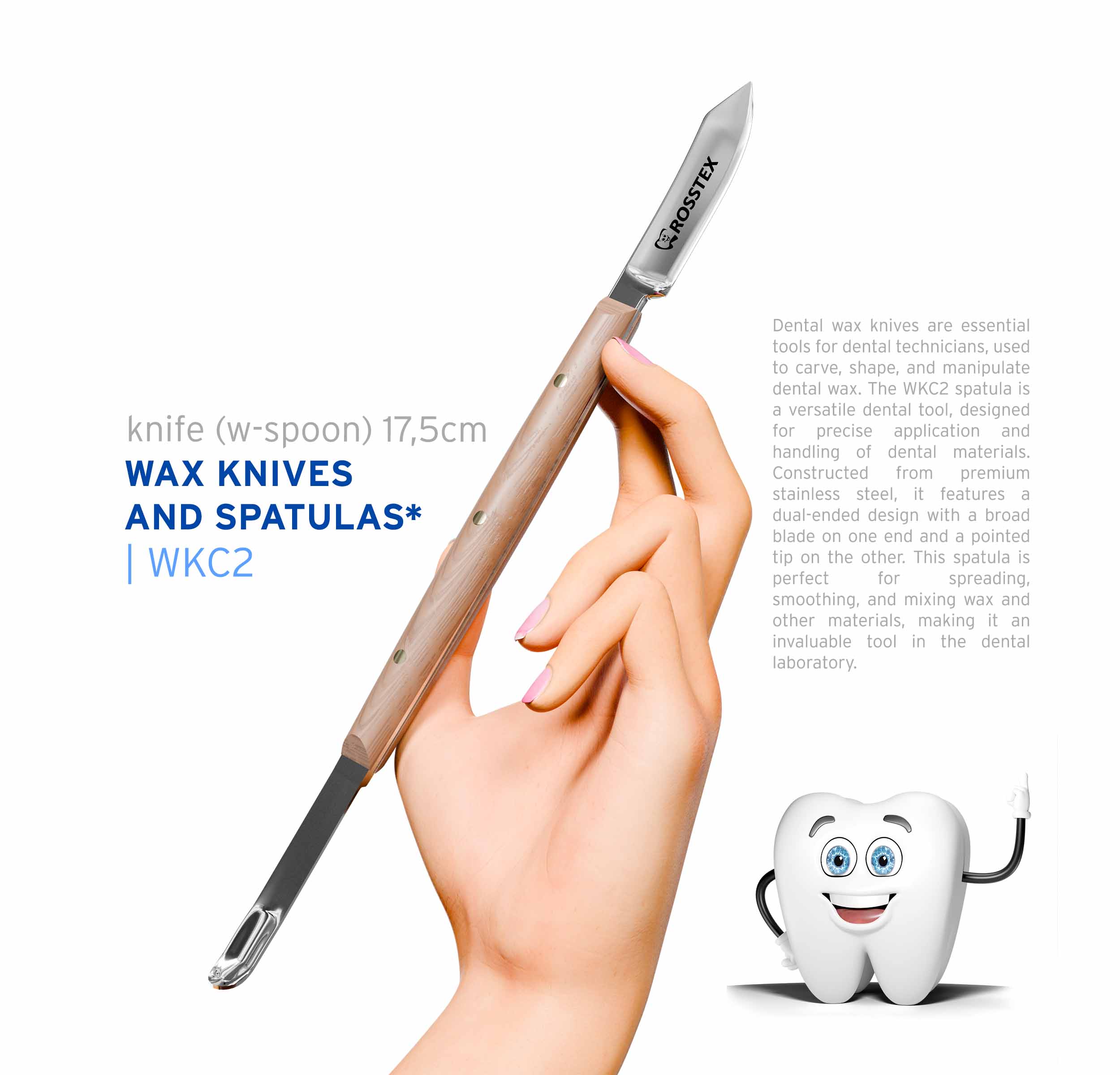 Wax Knife (W-Spoon) 17.5cm WKC2 is a versatile dental laboratory instrument designed for sculpting and shaping wax. It features a spoon-shaped end for smooth wax manipulation and contouring. Made from high-quality stainless steel, it offers precision, durability, and is fully autoclavable for repeated professional use.