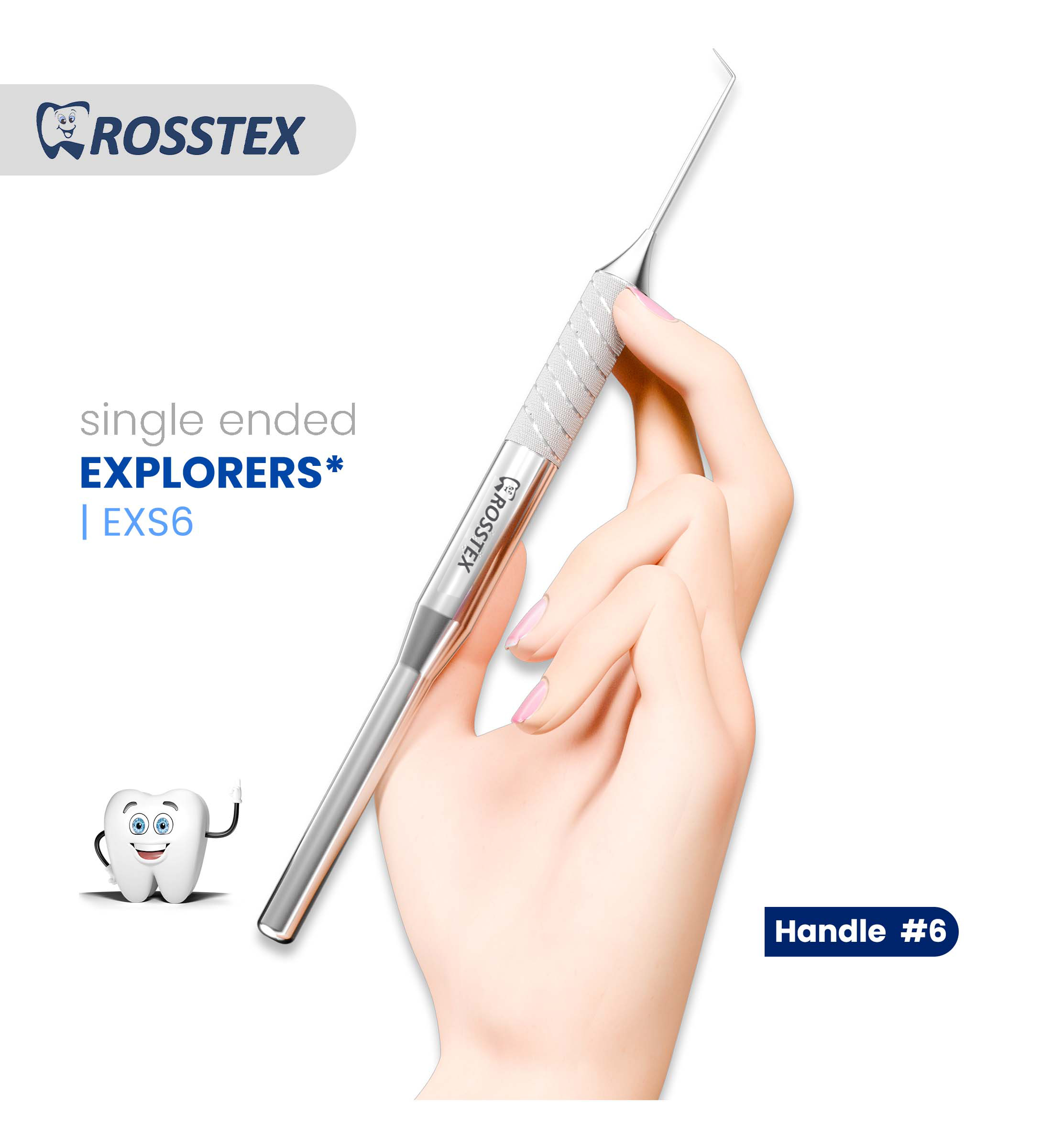 ﷼. 45.00 ﷼. 45.00 ﷼. 45.00 EXS6 Dental Explorer features a flexible yet strong nib with a straight, long shank and a sharp bend at a relatively short 6.5mm tip, designed for precise detection and penetration into the apical foramen and other narrow areas.