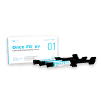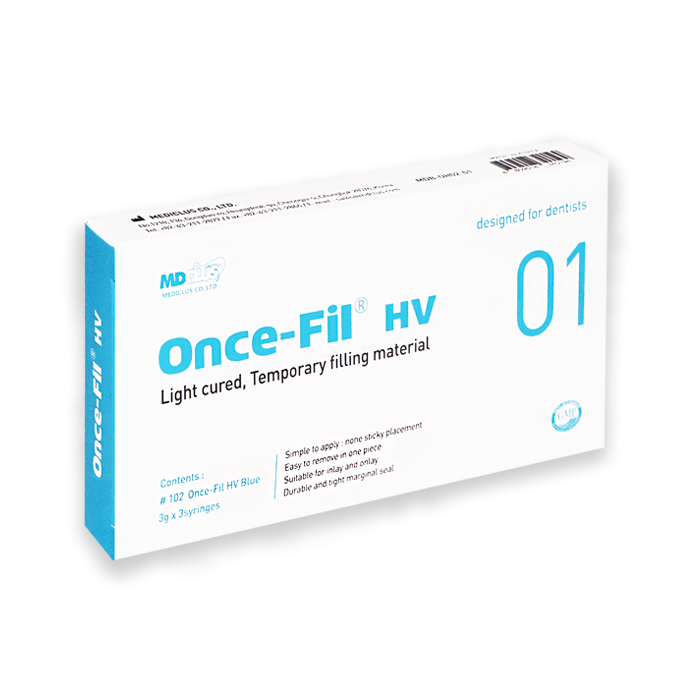 Once-Fil HV is a light curing temporary filling material. Due to its elastic and high viscous characteristics, it can be used simply, easily and suitably for temporary filling such as in-lays and on-lays.